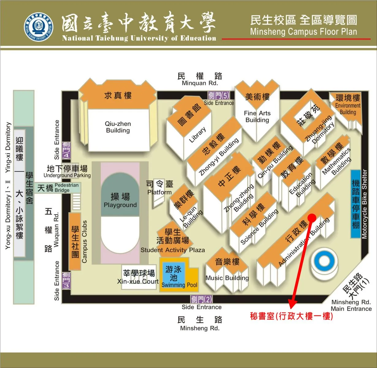 連絡方式 地址:40306台中市西區民生路140號(辦公室位於行政樓一樓) 電話:04-22183126、04-22183372 傳真:04-22183120 E-mail:sec111@mail.ntcu.edu.tw