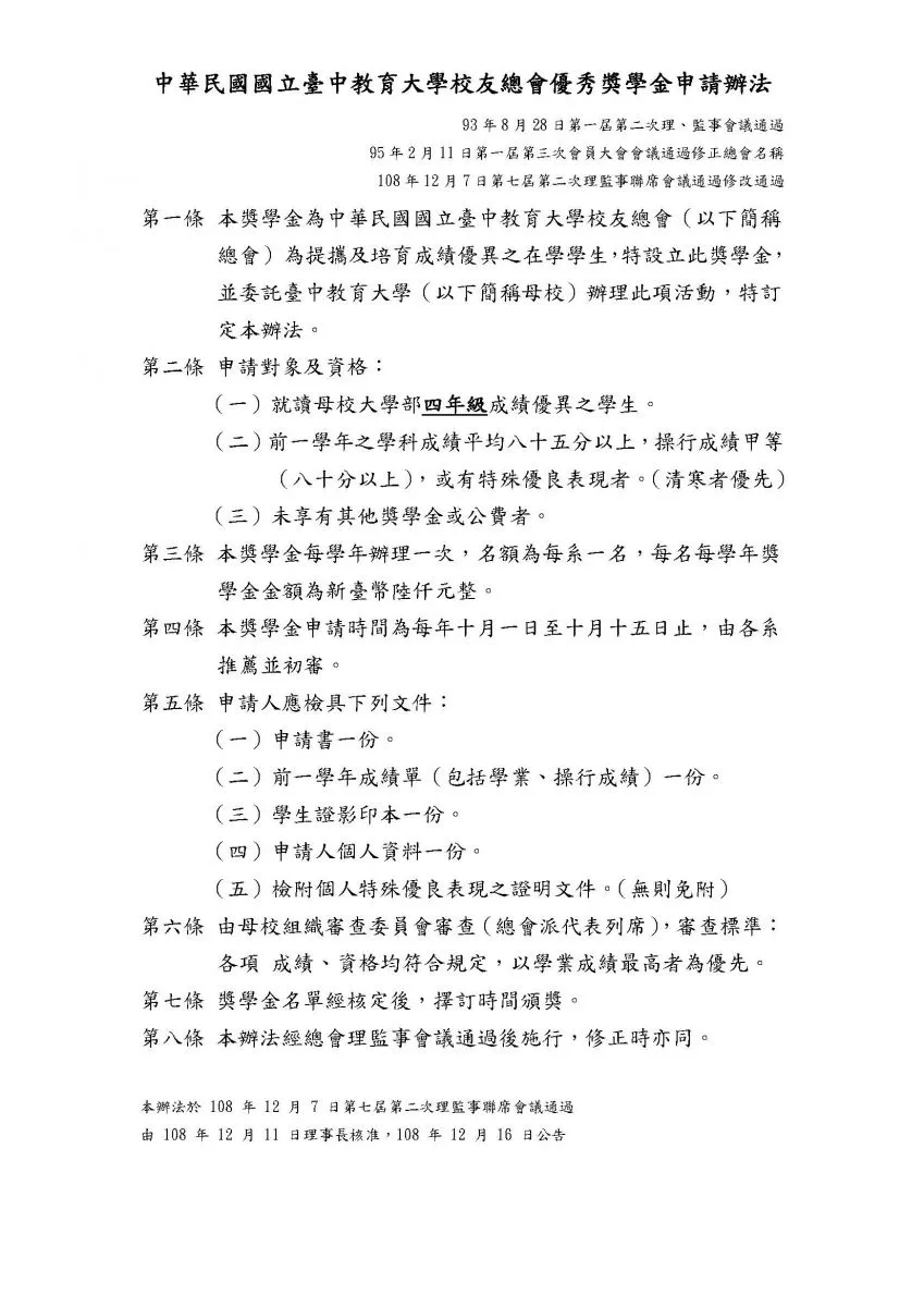 國立臺中教育大學校友總會優秀獎學金申請辦法