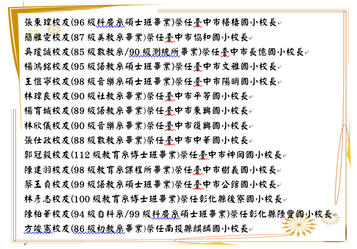 恭賀 張仕政校友 榮任 臺中市北 區中華國民小學校長