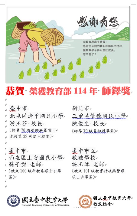 教育部公布114年師鐸獎獲獎名單,今年共計選拔出72名獲獎者, 本校有4位校友榮獲殊榮,分別為: