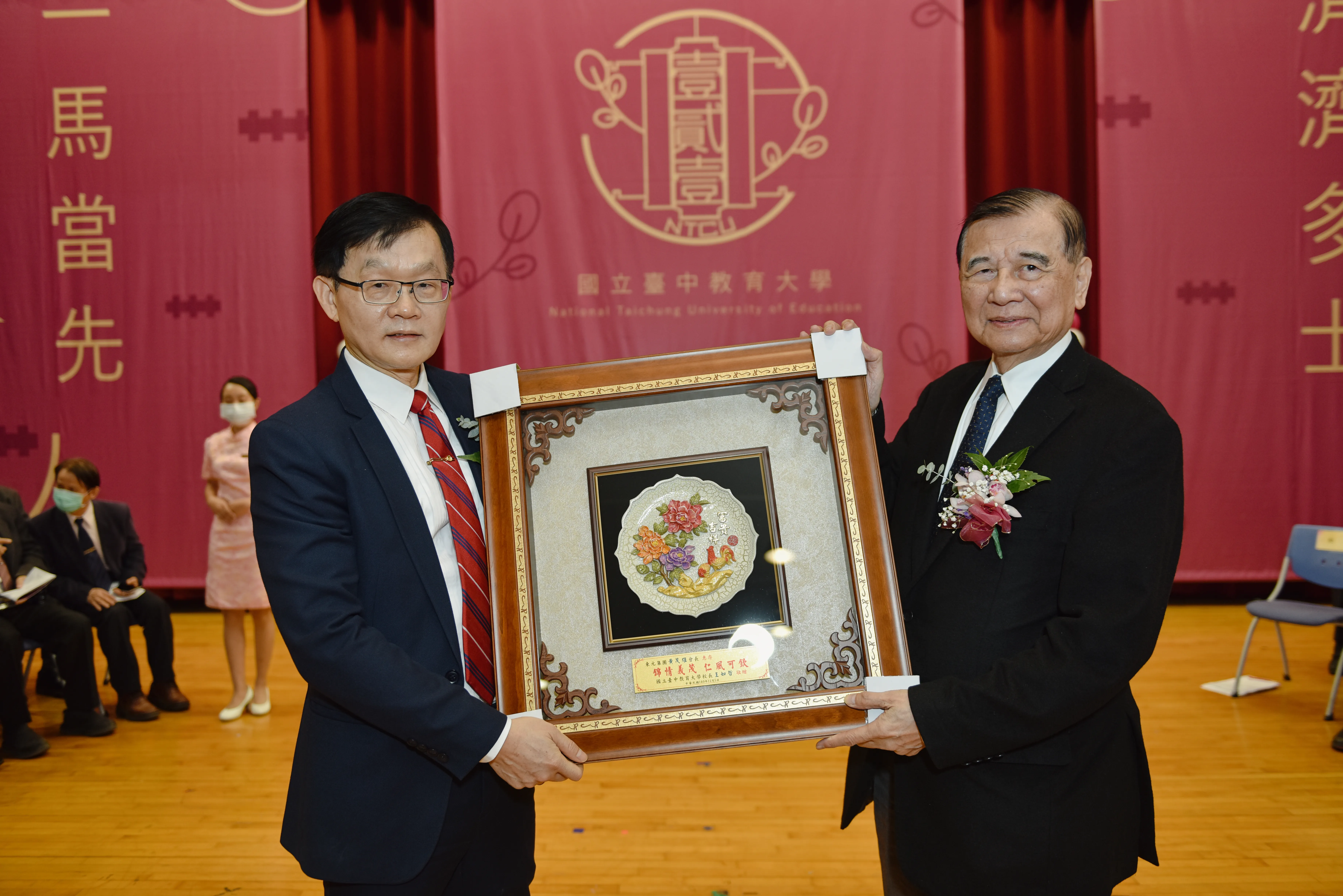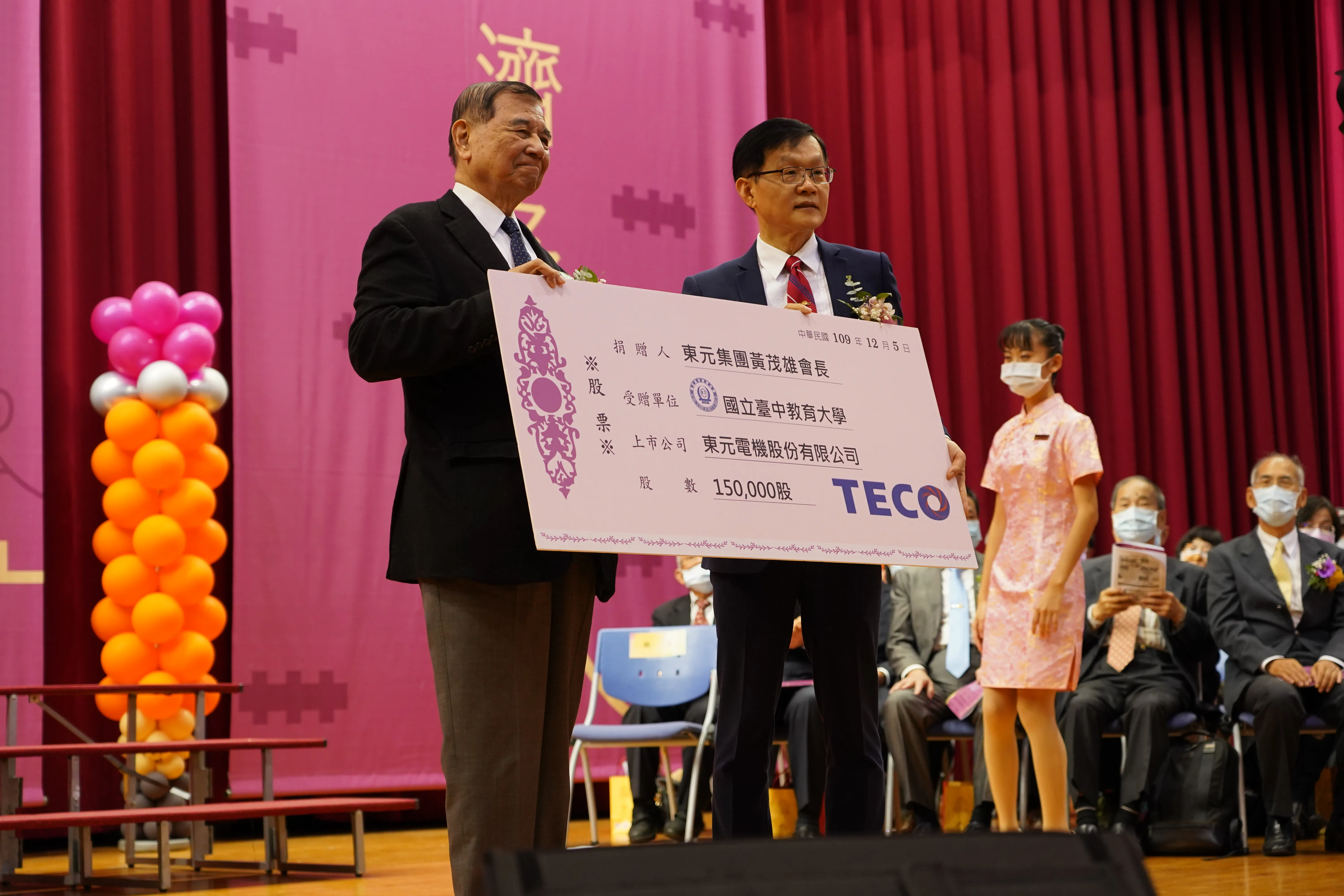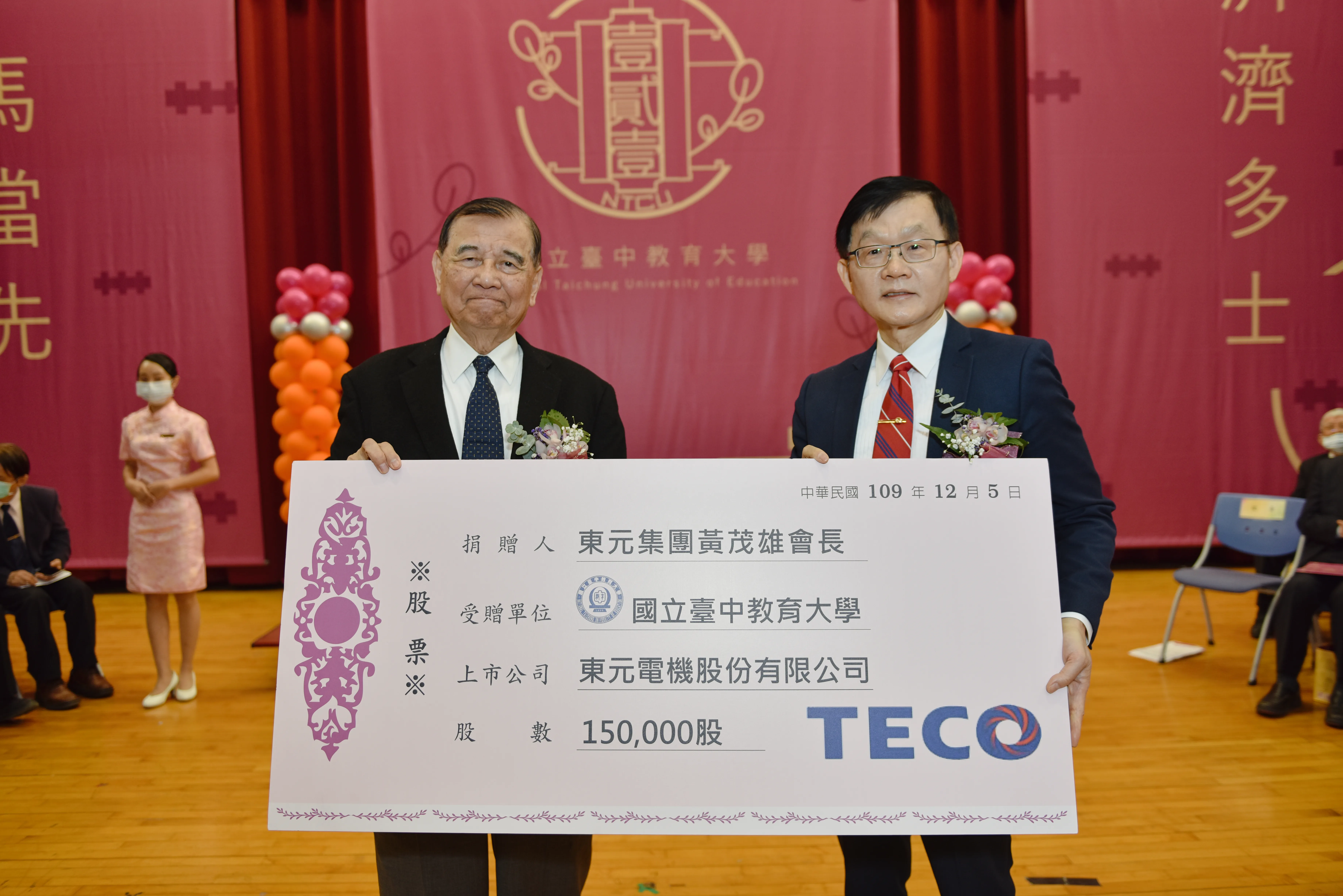 黃茂雄會長承襲父志,為提攜及培育臺中教育大學之學生,捐贈東元電機股份有限公司15萬股及台灣高速鐵路股份有限公司之股票10萬股,進行有助於學生學習之規劃,資助學生學習獎助學金,並提供本校學生更多元學習方式的資源。本校假109年12月5日121週年校慶慶祝大會邀請黃會長蒞臨本校,特於大會上頒贈感謝獎牌,感謝黃茂雄會長之善心義舉、愛人助人之情操!